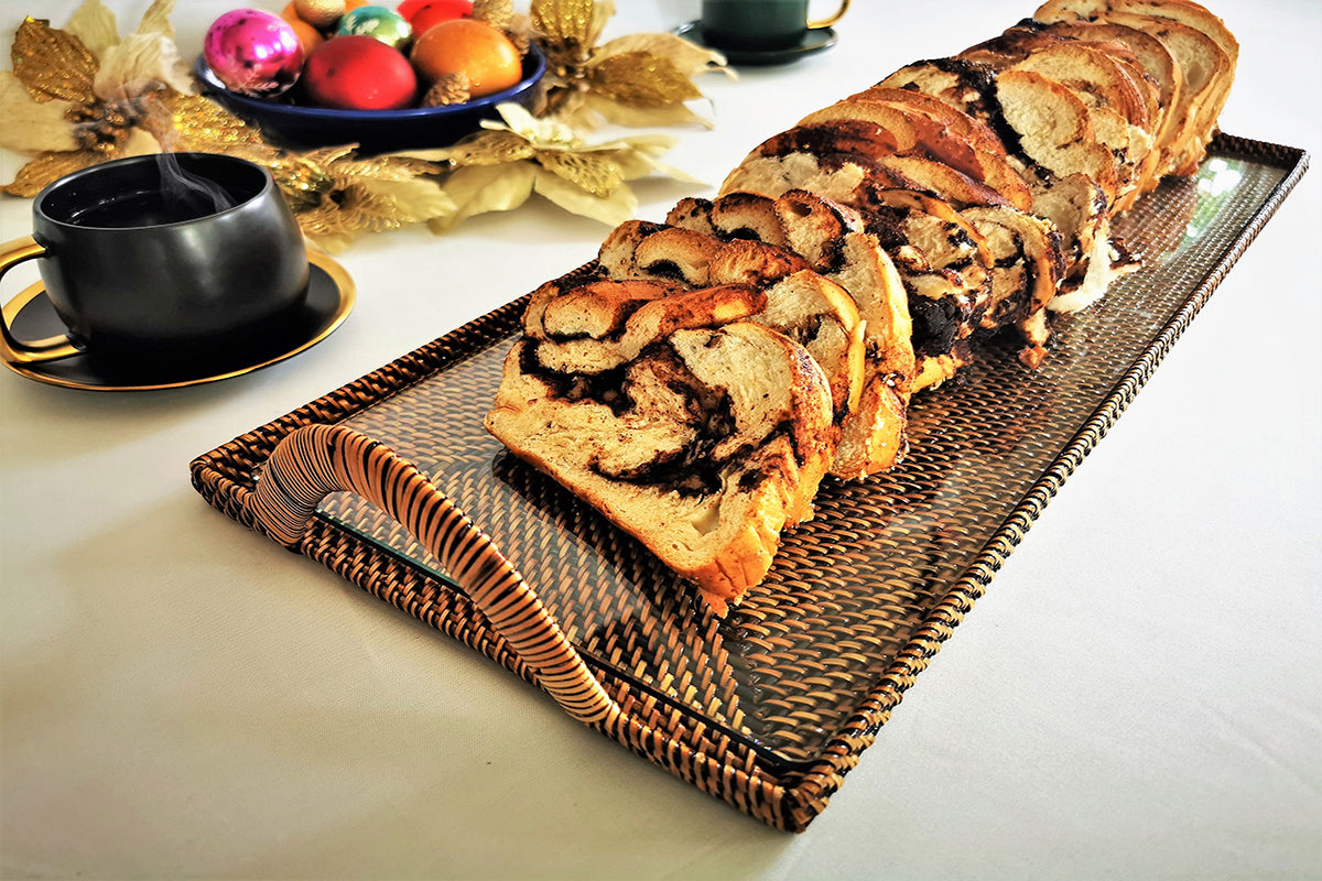 This robust tray is ideal for the elegant host or hostess because it has a fitted glass insert and a woven diamond pattern design. Its organic earthy tones create a rustic modern and visually appealing appetizer presentation.